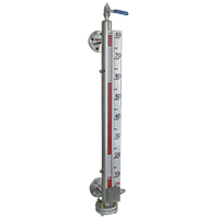 液位计根据浮力原理和磁性耦合作用研制而成。当被测容器中的液位升降时,液位计主导管中的浮子也随之升降,浮子内的永 久磁钢通过磁耦合传递到现场指示器,驱动红、白翻柱翻转180º,当液位上升时,翻柱由白色转为红色,当液位下降时,翻柱由红色转为白色,指示器的红、白界位处为容器内介质液位的实际高度,从而实现液位的指示。